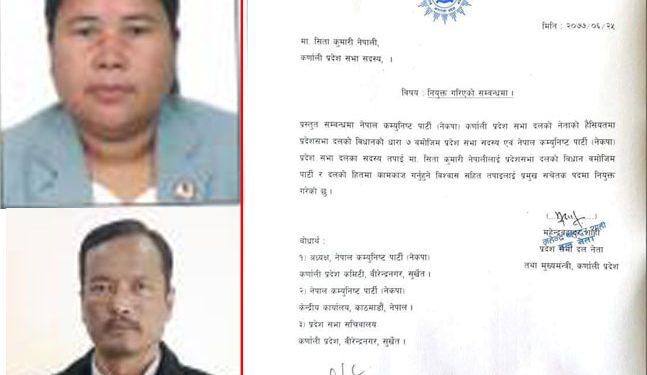 ‘प्रस्तुत सम्वन्धमा नेपाल कम्युनिस्ट पार्टी नेकपा कर्णाली प्रदेश सभा दलको नेताको हैसियतमा प्रदेश सभा दलको विधानको धारा ७ बमोजिम प्रदेश सभा सदस्य एवं नेपाल कम्युनिस्ट पार्टी नेकपा प्रदेश सभा दलका सदस्य तपाईँ सीता कुमारी नेपालीलाई प्रदेश सभा दलको विधान बमोजिम पार्टी र दलको हितमा काम काज गर्नुहुने विश्वास सहित तपाइलाई प्रमुख सचेतक पदमा नियुक्त गरेको छु’, प्रदेश सभा दलका नेता तथा मुख्यमन्त्री समेत रहेका शाहीले नेपालीलाई दिएको नियुक्तिमा भनिएको छ ।नेपालीलाई प्रमुख सचेतकमा दिएको नियुक्तिको बोधार्थ नेकपा कर्णाली प्रदेश कमिटीका अध्यक्ष, नेकपा केन्द्रीय कार्यलय काठमाडौ र प्रदेश सभा सचिवालय कर्णाली प्रदेशमा पठाइएको छ ।
