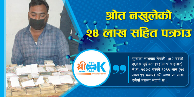 जिल्ला प्रहरी कार्यालय रुपन्देहीको टोलीले सुरक्षा जाँचका क्रममा भैरहवाको सिद्धार्थ बसपार्क नजिकबाट २४ लाख रुपियाँ सहित १ जनालाई नियन्त्रणमा लिएको छ । गत बिहीबार बुलुका करिब ४ बजे सिद्धार्थनगर नगरपालिका वडा नं. २, सिद्धार्थ बसपार्क नजिक बेलहियाबाट भैरहवा तर्फ आउदै गरेका सम्मरीमाई गाउँपालिका वडा नं. ६ बस्ने प्रमोद कुमार गुप्ताले आफुले चलाएको लु ४३ प १२३१ नं. को मोटरसाइकल बाँया लेगगार्डमा झुण्डयाई राखेको अवस्थामा चेकजाँचका क्रममा फेला परेको जिल्ला प्रहरी कार्यालय रुपन्देहीका प्रहरी नायब उपरिक्षक तथा सूचना अधिकारी सत्यनारायण थापाले बताए ।