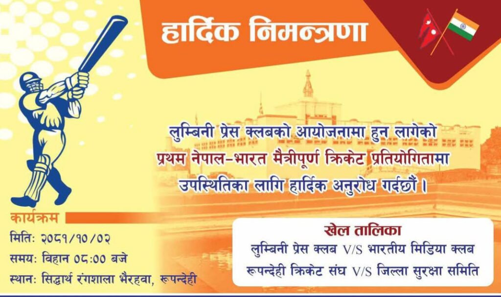 लुम्बिनी प्रेस क्लवको आयोजनामा हुन लागेको यो प्रतियोगिताको पहिलो सस्करण रहेको र क्लवको बार्षिक तालिका अनुसार प्रतियोगिता आयोजना हुन गैरहेको क्लवका अध्यक्ष कमल रायमाझीले बताए प्रतियोगिताको टाइटल ” प्रथम नेपाल-भारत मैत्रीपूर्ण क्रीकेट रहेको छ ।